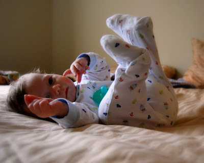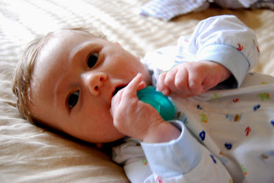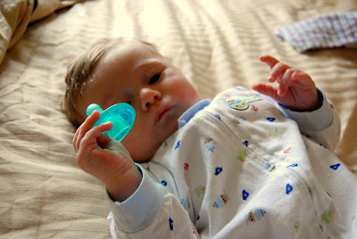 Ethan's beginning to figure out his hands and legs. Below are some photos of him hanging onto his Soothie and kicking his legs. It's a great milestone that we're really proud of- but now he's like a little Curious Houdini. He doesn't want to go to sleep because of the amazing world around him. We can't keep him swaddled OR sleeping.