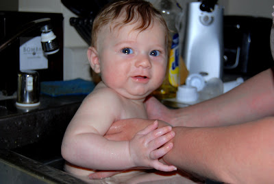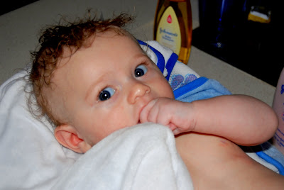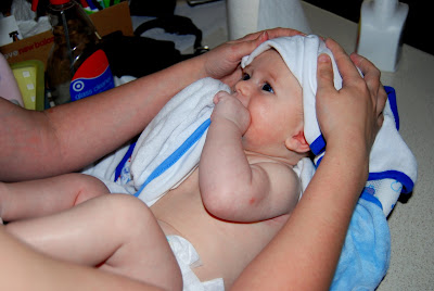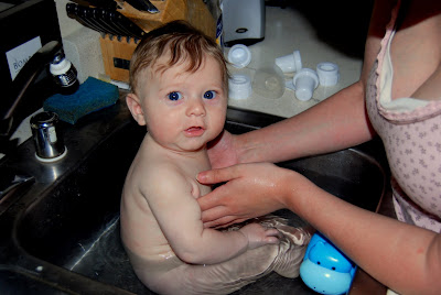 Ethan's had an exciting week. He went to the Doctor because he has thrush, reflux, and allergies that are causing his face to break out. We also gave him a bath today. The bath was the fun part!